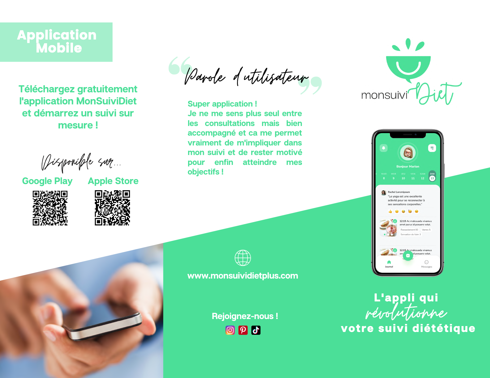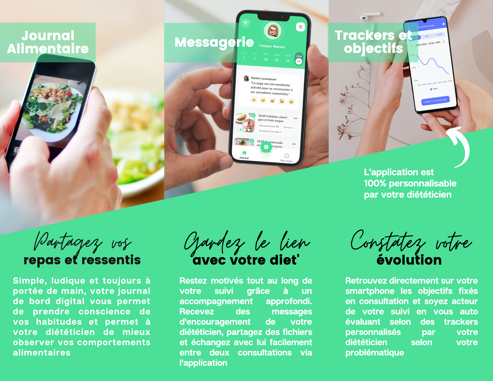 L’application MonSuivi Diet est incluse dans votre accompagnement diététique. Elle vous permet de garder le lien entre les consultations et suivre vos objectifs !